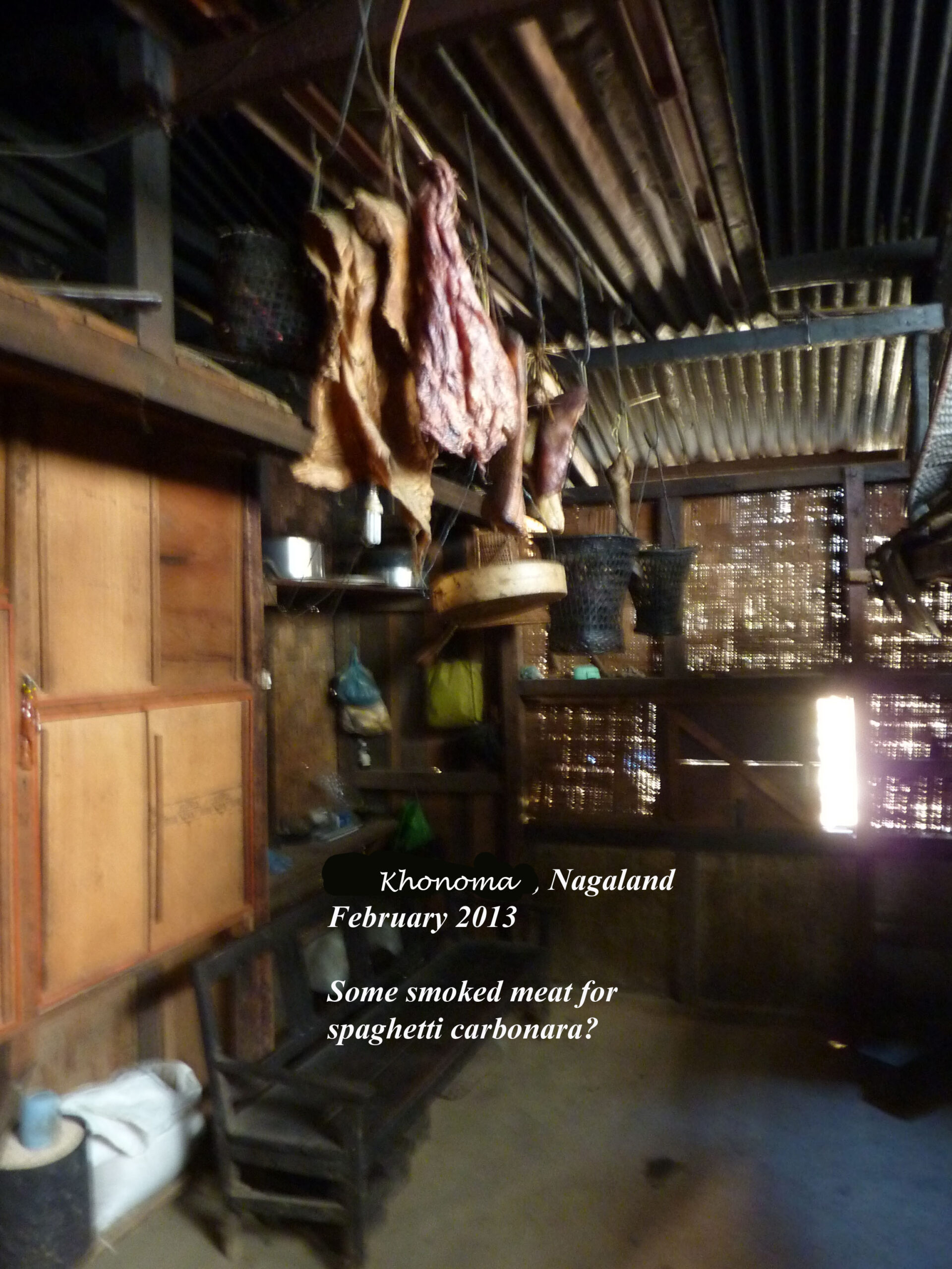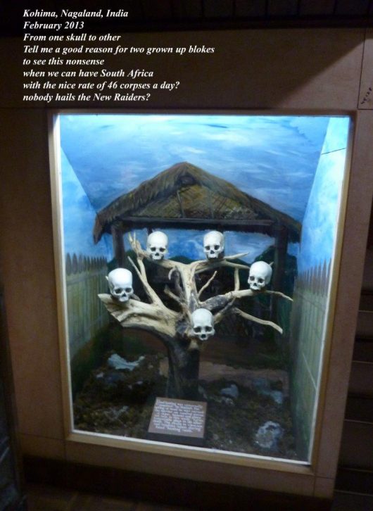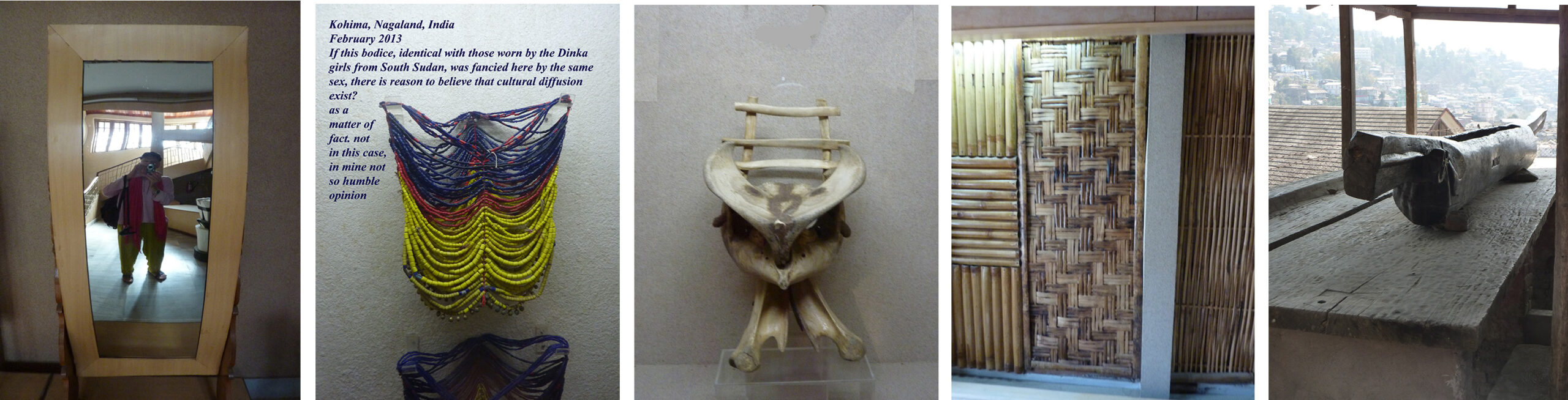 Quant au Nagaland State Museum, bien en deçà de nos attentes, il eut quelques vertus. D’abord, il fut un abri lors d’une journée aux conditions atmosphériques exécrables ; ensuite, il permit l’identification de quelques objets représentatifs d’une culture approchant l’extinction ; et finalement, il permit l’amusement vicieux d’identifier des exponats n’ayant aucune raison d’être là.