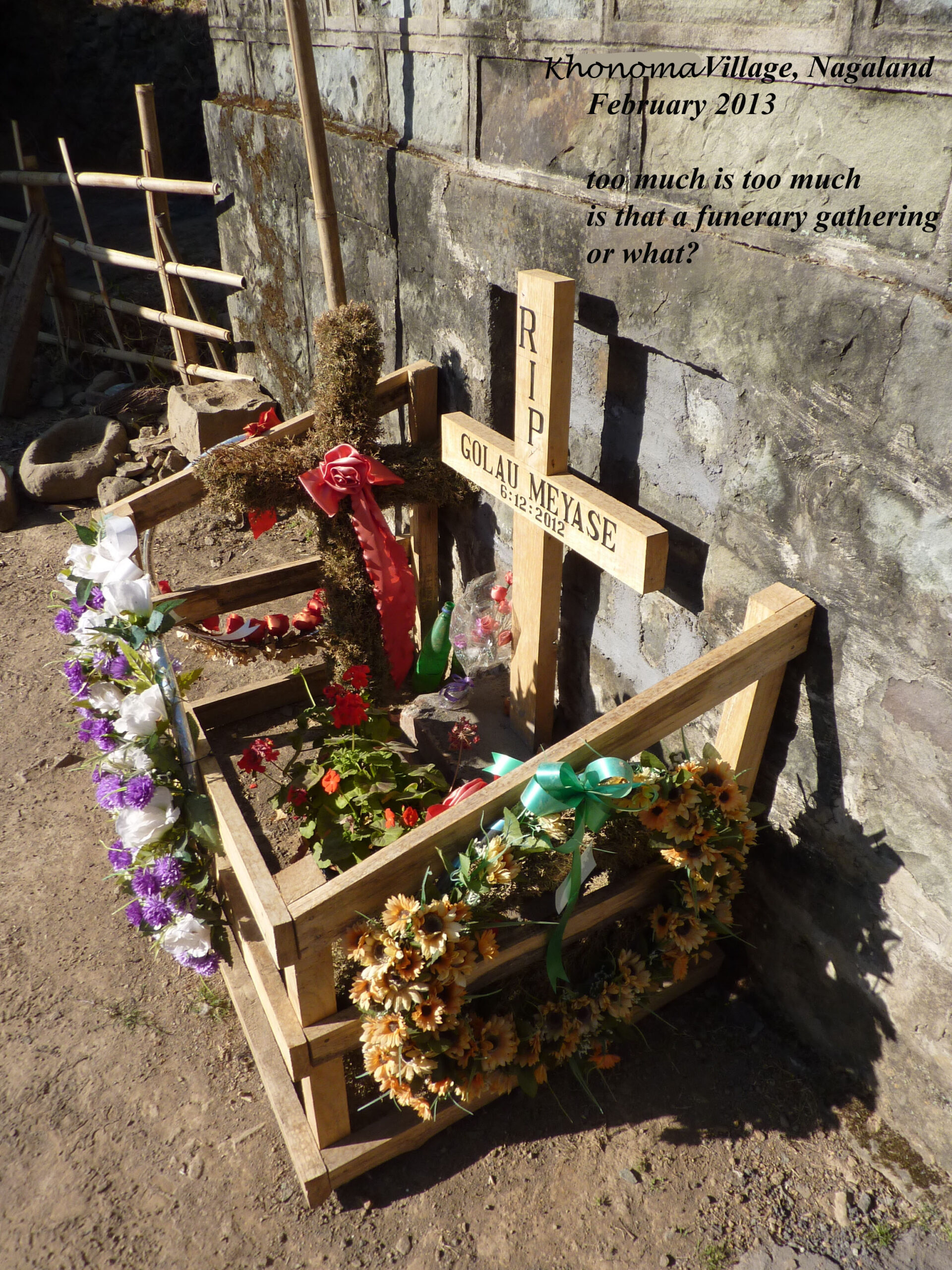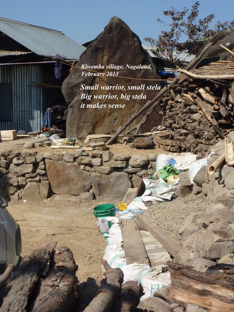désir de finir mon rapport sur une note plus enjouée, je tiens à informer tout le monde que les Naga ont l’habitude de garder leurs chers disparus enterrés dans la cour. Une pierre tombale en pain de sucre aplati marque l’emplacement du « chef » ou du crâne, si vous voulez. L’inscription gravée dessus, en anglais — car ces gens sont passablement anglophones — contient des détails de la vie et éventuellement des mérites du défunt. Après m’être acharné à lire une vingtaine de ces stèles (ou plaques informatives), sans que j’aie trouvé le nom d’une seule dame, je suis arrivé à la conclusion, qu’il faut garder secrète, que dans le Nagaland, les femmes ne meurent jamais. Donc, bouche cousue, car autrement ce sera la ruée : des pépées du monde entier vont arriver ventre à terre !