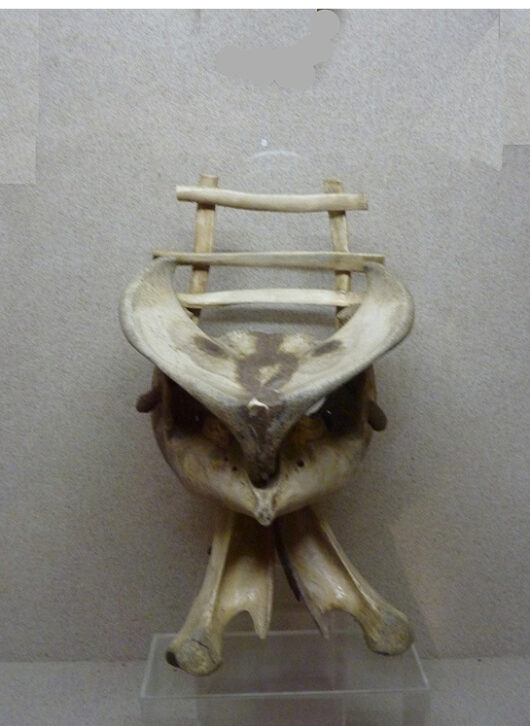 La confusion de l’entrée se prolongeait-elle à l’intérieur ? Faisons-nous une idée avec l’aide des illustrations, sans trop de préjugés. Le miroir déformant (n° 1) est complètement hors de contexte. Le beau corsage en perles (n° 2) soulève la grande question : diffusion du motif (on le rencontre aussi chez les Dinka du Soudan) ou origines multiples ? Le siège (n° 3) en os de bovidés est légitime, mais de facture nouvelle. La claustra en tiges de bambous (n° 4) rend à peine justice à cette forme d’artisanat local de grande qualité. Et enfin, un formidable tambour à fente (n° 5) montre avec fierté les cicatrices d’une longue utilisation.Il est bel et bon.
