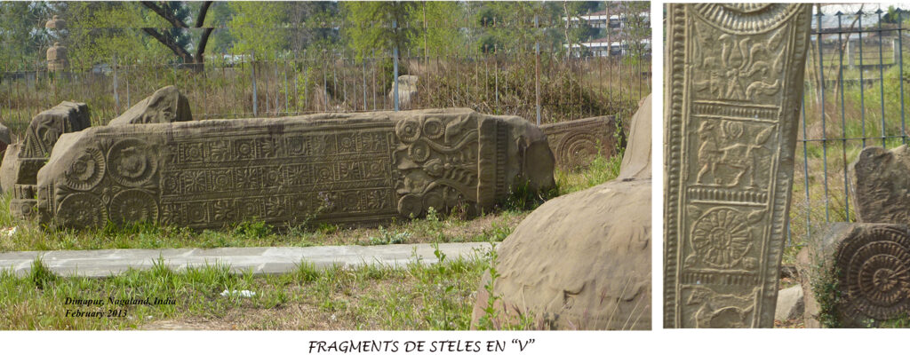 C’était le moment de tirer ma révérence, content de mon succès d’estime, une date possible et un patron probable, quand le Malin m’incita à fouiner un peu plus. Et le fleuron de l’UNICITÉ qui s’en va à l’eau après que je découvre avec désespoir un autre site Kachari bien farci d’énigmes, le Kasomari Pathar situé à 76 km au nord de Dimapur. Le site, qui compte 32 ou 33 monuments monolithiques — au point qu’à un moment je doutais de leur authenticité — contient, avec une seule exception, seulement des stèles finissant en arc semicirculaire. La séquence entière avait été décorée par un dessin standard avec de légères variations. On reconnaît encore la division en trois registres. Le motif dominant en haut-relief formé de volutes contenant des rosettes est logé dans la section moyenne. Il a une apparence végétale et finit souvent en fleur de lotus. Le panneau rectangulaire sur lequel il prend appui, aussi bien que la section supérieure quelquefois, sont richement décorés avec des motifs animaliers stylisés, réalistes et