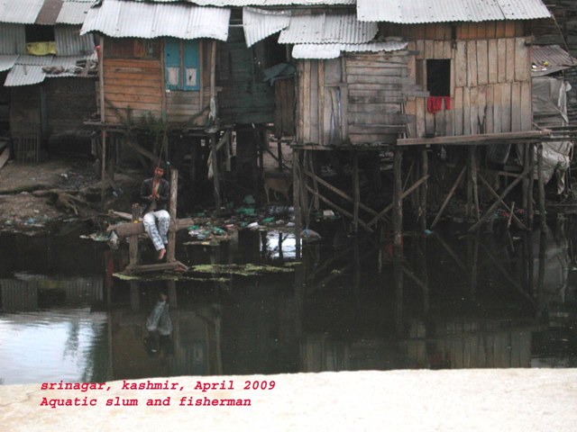 In the after noon, we boarded a low-on-water, very well-balanced shikara and harrowed the blue-green liquid ground in search of exciting finds. There weren’t many, but the smell of authenticity—sometimes pungent—was unforgettable! We passed boats selling vegetables, boats selling house hardware, people-carrying boats, boats selling tourist regalia, flowers and seeds, traditional medicines, outstanding textile outfit of wool and silk (are they all manufactured in Kashmir?), eventually goats—and many others I’ve now forgotten. We visited the cute floating market (more than instrumental for the locals) and went stright for a superb aquatic slum I put an eye on already the yesterday. I must avow: I’m in love with houses on stilts.Their constructivist simplicity—Tatlin-style—perfectly articulates empty, prismatic spaces. I had visited similar homes in Iquitos, Peru, and was enchanted. Even their miserable