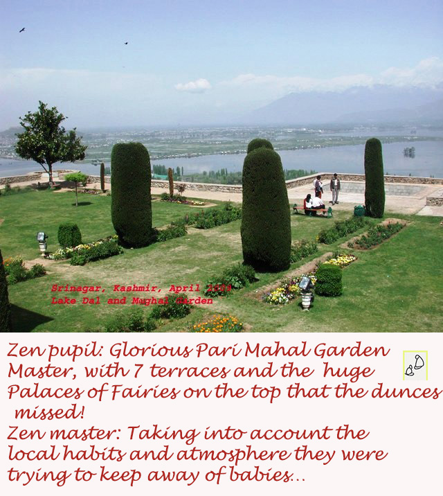But we had bigger fish to fry and coldly left the lake’s anarchic, entropic ensemble for the realm of order, reason, and poise—namely, the matchless Nishat Bagh Mughal garden. Thank God the Principal endowed me with more patience than brains. Who needs brains, anyway? Mankind is overflooded with that grey, soft, mucilaginous matter—and look where it’s gotten us.