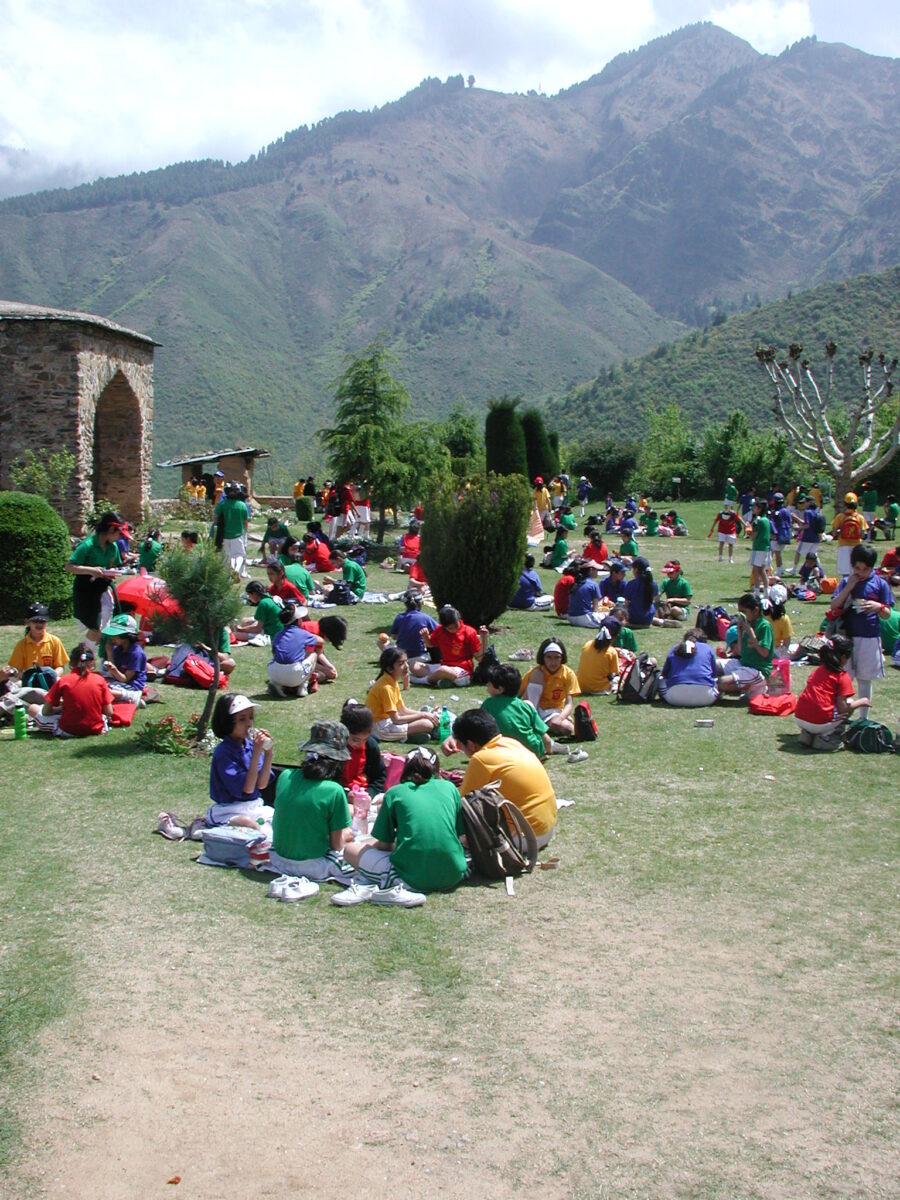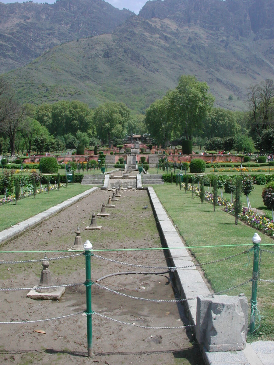 This interplay of stone and water culminates in a strong axial layout, distributed across a series of terraces—twelve in the case of Nishat Bagh—that echo the site’s natural elevation and the staged drops of the water flow. The terraces, connected by stone staircases flanking the watercourse, are adorned with expansive lawns, sculpted shrubs, rows of chinar and cypress trees, and floral beds. The entire design is governed by symmetry and geometric precision—rectangles within rectangles—where the right angle becomes the ruling principle of order and aesthetic clarity.These gardens are closely associated with Shah Jahan, visionary patron of the Agra’s  Taj Mahal and arguably the most remarkable ruler of the Mughal Empire. While the empire (1526-1857) was established by a Persianized Central Asian Turkish-Mongol dynasty that chose Srinagar as its summer capital, a broader historical context, though compelling, may be left aside.What remains is the immediate experience: gardens as serene oasis, ideal for contemplative encounters with curated nature. Today, they attract waves of Indian tourists—eager to share views of snow-capped mountains and flowing water with their children—as well as honeymooners, veteran old couples and visitors dressed in rented Mughal-era costumes to relive a sense of bygone splendor. With a bit of luck, one might also glimpse local women and girls enjoying a rare moment of leisure and freedom (!).