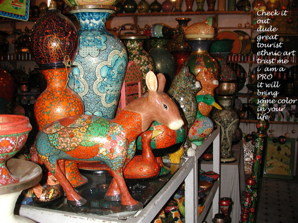 We arrived. I dislike emporiums. They are stuffed with thousands of objects. You can barely look to one. Manic vendors are continuously prodding you with small but sharp invisible tridents. They don’t like singles, they prefer groups. And they are great for giving you a guilty feeling. A psychological war take place under the open sky. Being a battle tested veteran I try to bring them on the brink of a nervous breakdown by putting stupid questions and suggesting ridiculous prices. At the very end I get the object of desire. Then smiles, good whishes and congratulations are exchanged. This time was a smashing embroidered coat that I dress anytime I want to offer to people around a discussion topic for a month or two. The craftmanship is superb no matter the material or technique: papier maché, walnut wood, carpet weaving, wool, silk, bronze, ceramic, tissue, glass you name it. The Pachima shawl has conquered the world. I cannot imagine a hottie that doesn’t have it or won’t acquire it tomorrow. The dominant aesthetic mode is horror vacui, i.e ‘fear of empty space’ leading to a decoration that expands over surface patterns, motifs, and images as tightly as pieces of baklava inserted in a baking tray.
